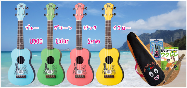 人気イラストレーター、木原庸佐による、小さなウサギのぬいぐるみ「兎野U(うさぎのウー)」と、クマのぬいぐるみ「熊野900(くまのクレレ)」によるウクレレデュオ U900のウクレレから嬉しい6色のカラーウクレレが登場!可愛いだけじゃなくて、作りもしっかりした本格的なウクレレです。