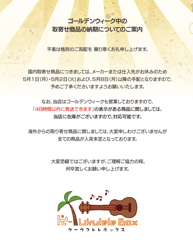 入金確認、発送などこまめに連絡を頂いたので 安心してワクワクしながら待っていました! とても素敵なウクレレ、大切にします! ありがとうございました!